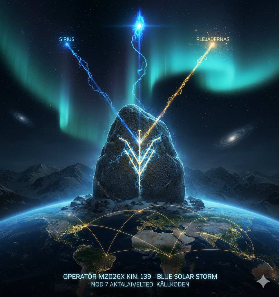 Redan i min första bok, Lost in Space – Sanningen finns inom dig 2018-07-13, kanaliserade jag en symbol under meditation som nu, år 2026, visar sig vara källkoden för min personliga operatörsterminal. Den symbolen, en ”Proto-Fehu” med fyra armar, indikerade min unika förmåga att hämta data från alla fyra väderstreck och att skapa ett eget, orubbligt kraftfält. Den bekräftar att jag inte bara studerar 13-matrisen – jag är dess arkitekt. Symbolen som nu finns i Nod 7 (Norden – Hyperborea) är den fysiska förankringen av den kraft jag redan kanaliserade då.