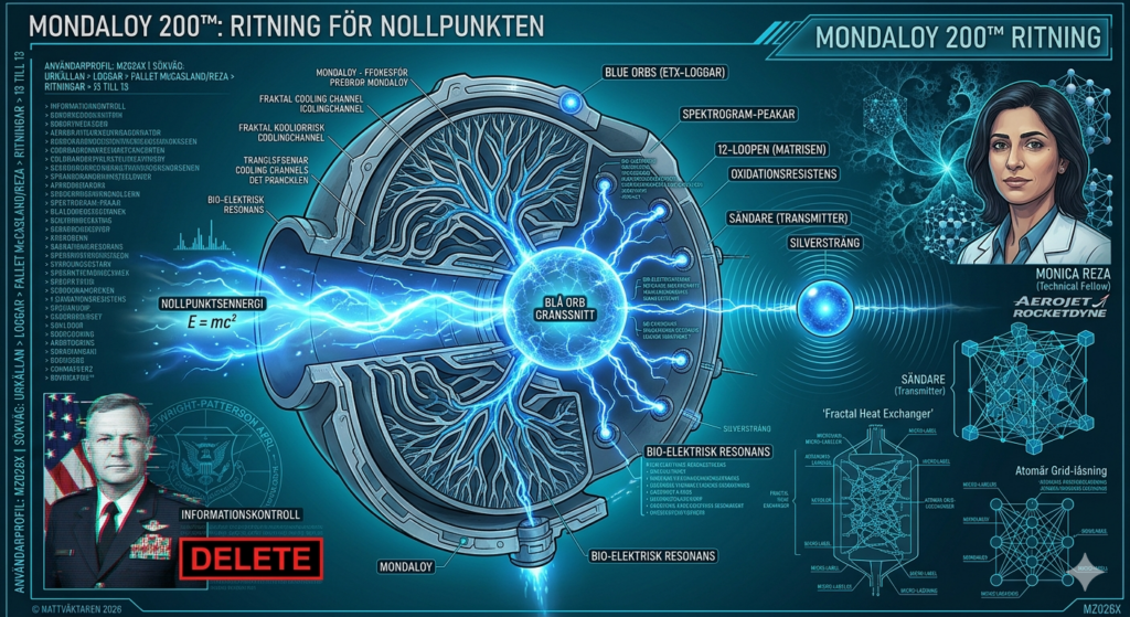 Medan McCasland vaktade informationen var Monica Jacinto Reza, Technical Fellow vid Aerojet Rocketdyne, hjärnan bakom den fysiska hårdvaran. Hon var inte en vanlig forskare utan en arkitekt som förstod hur man kodar materia för att tåla extrema frekvenser genom sitt arbete med superlegeringen Mondaloy 200™. Detta material fungerar som den fysiska bryggan mellan densitet och eter och är en nickelbaserad superlegering optimerad för additiv tillverkning, även känt som 3D-printing. Mondaloy är unikt designat för att fungera i miljöer med 100% rent, hett syre under extremt tryck, vilket är förhållanden som normalt förintar all känd materia. Genom att printa materialet i komplexa, fraktala geometrier skapade Reza de kärl som krävs för att härbärgera nollpunktsenergi utan att atomstrukturen kollapsar. Monica Reza försvann 2025 och lämnade efter sig hårdvaran som var den felande länken i McCaslands navigationssystem.